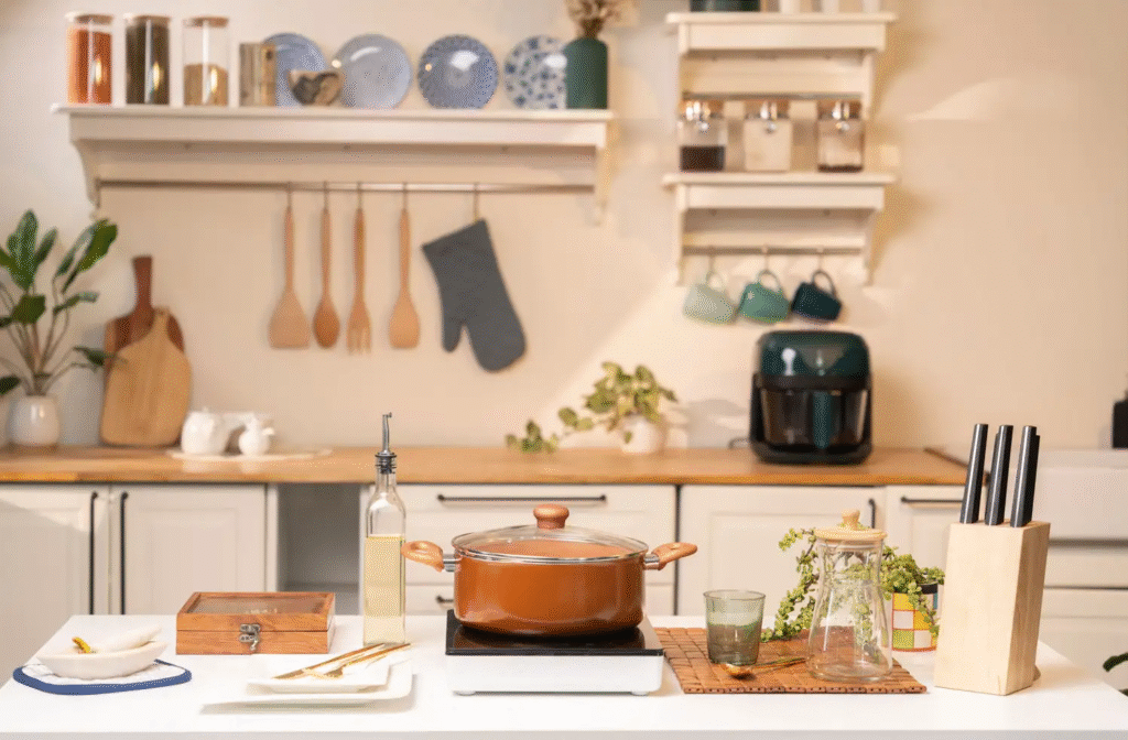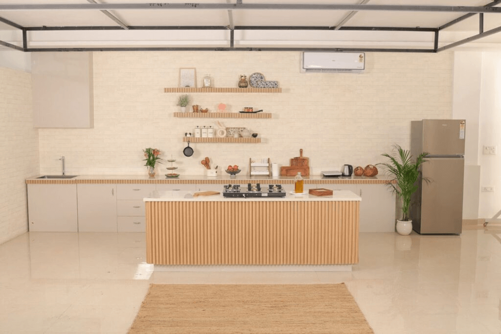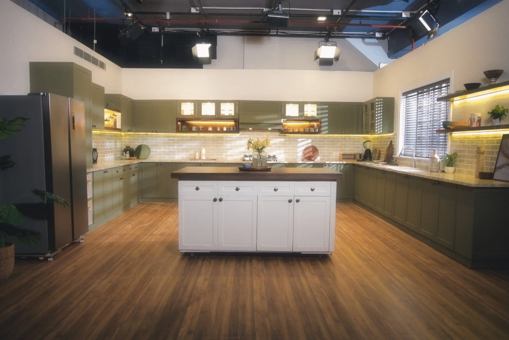The kitchen should feel real, not like a movie set. Look for modular kitchens with real working counters, induction setups, and movable fixtures that allow flexibility in framing your shots.